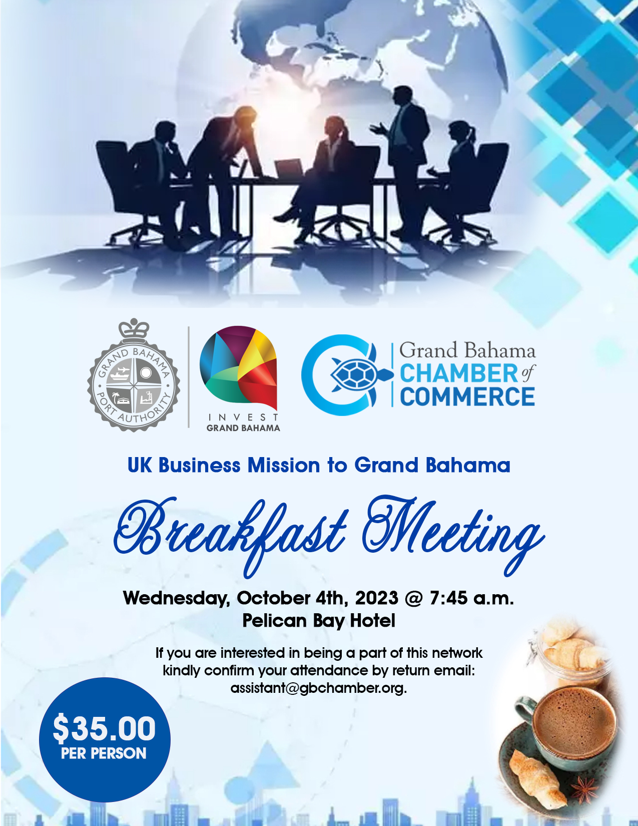 The delegation looks forward to meeting with Chamber members in their respective fields while in Freeport on October 4th during a Breakfast Meeting, which is scheduled to commence @ 8:00 a.m., registrations starts at 7:45 a.m., follow by one-to-one business meetings with participating companies between the hours 10:30 a.m. – 12:30 p.m. at Pelican Bay Hotel.
